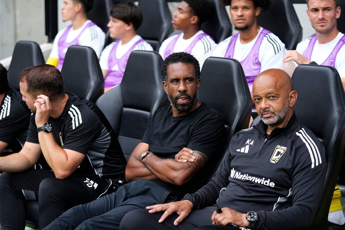 يشاهد ويلفريد نانسي، المدير الفني لفريق كولومبوس كرو، من مقاعد البدلاء قبل مباراة كأس الدوري لكرة القدم ضد نادي ليون في ملعب Lower.com Field في كولومبوس في 5 أغسطس 2025.
